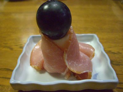 桃のシャーベットをハムの衣で包んで巨峰の頭の
