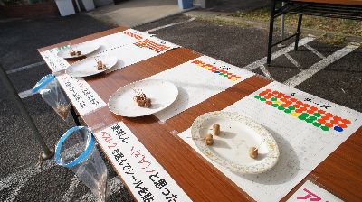 大村土井ハム工場の店頭にて、「新作ウインナーいろいろ食べ比べ」試食会