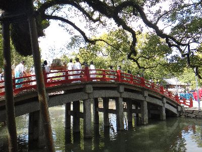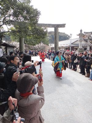 大鳥居をくぐって拝殿し、その後、曲水の宴が