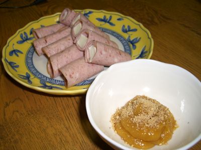 リオナソーセージで巻いて、酢味噌をつけて食べる。